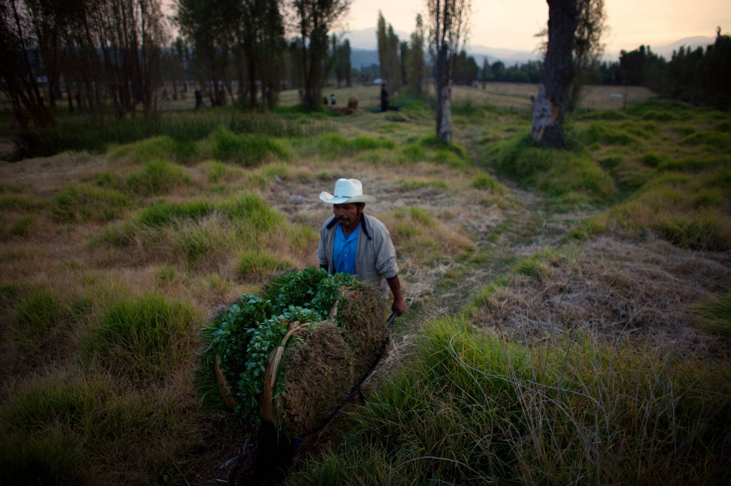 A farmer transports his vegetables by wheelbarrow in San Gregorio Atlapulco. Image credit: Cavan Images / Alamy.