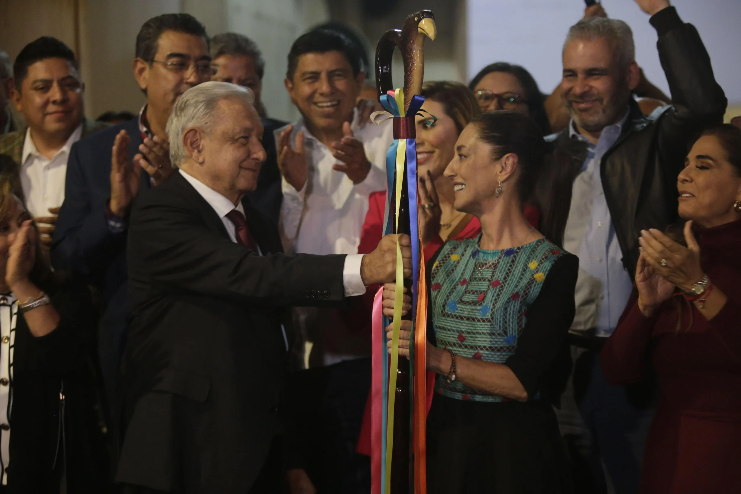 AMLO hands over Morena party baton to Claudia Sheinbaum in Mexico City, 2023. Photo credit: ZUMA Press.